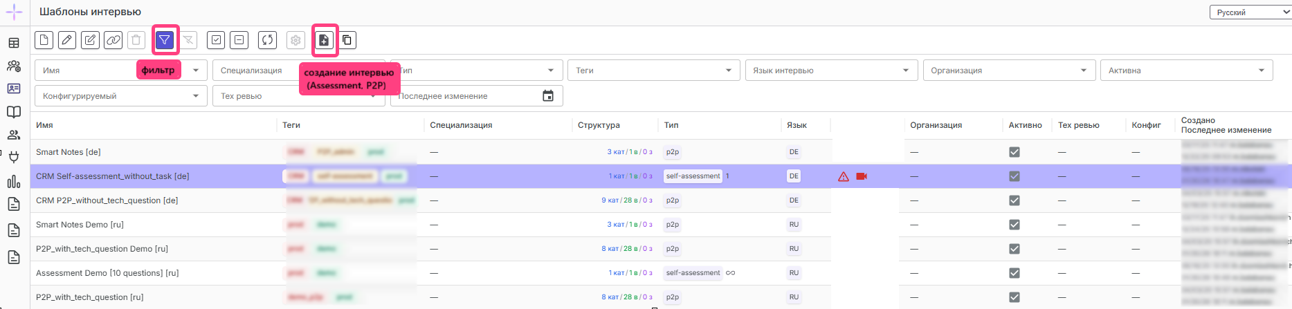 The Interview Templates page is the starting point for launching a new interview. After an interview is created, all further work with it continues in the corresponding system sections.