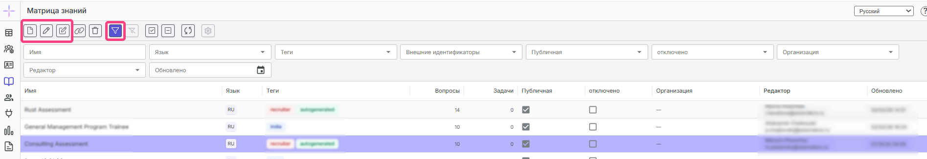 The Knowledge Matrices (Knowledge Scope) section is intended for creating and managing reference competency matrices. A matrix defines the topic structure, skills, and evaluation criteria for a specific specialization and is used as the basis for generating questions in interview templates.