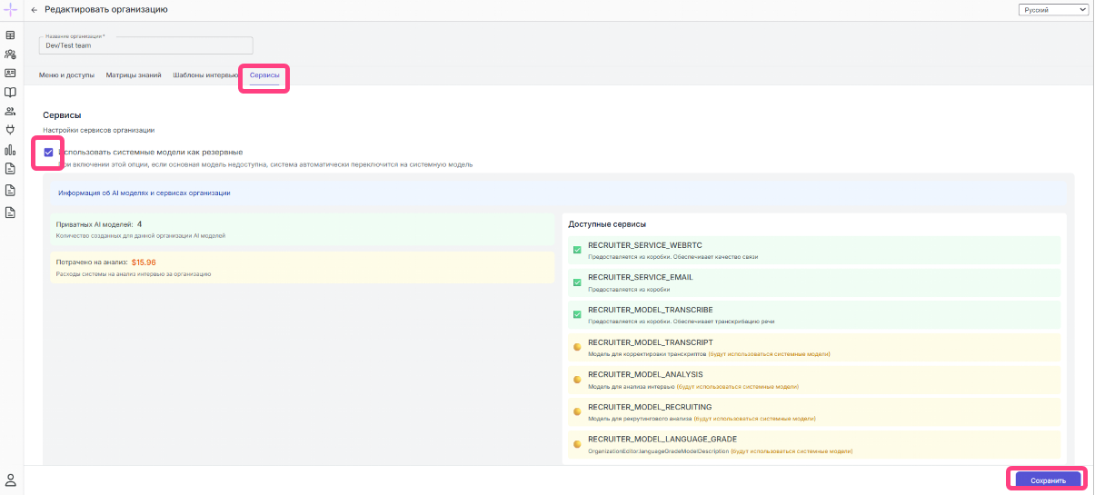 The Use system aliases option determines which internal services will be used by default for your organization. This may include the AI model for analysis, the transcription service, and the email service.
