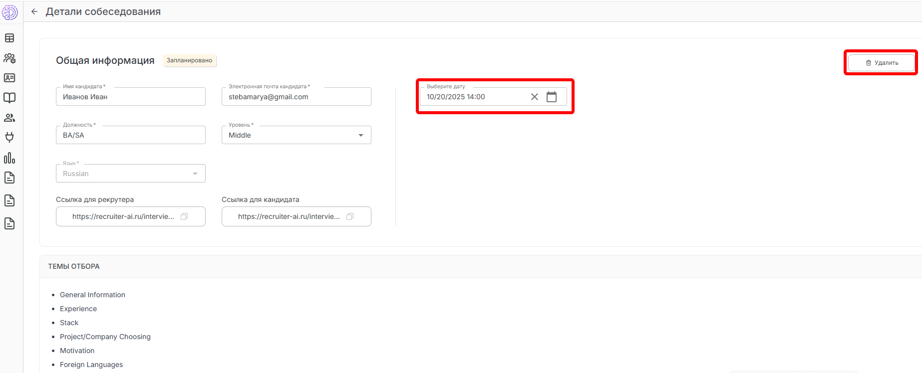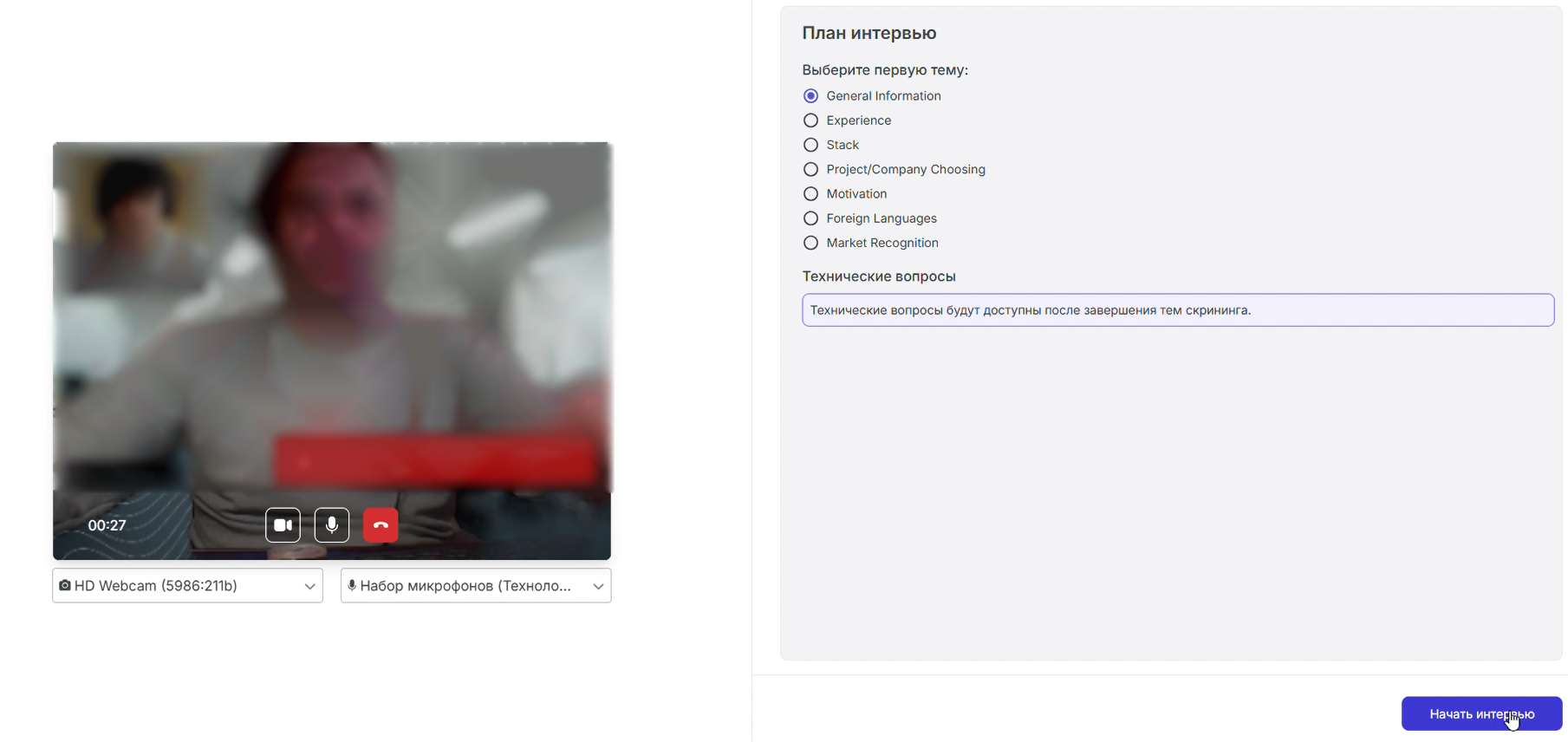After the interview starts, an interface with the Interview plan will open. It contains discussion topics such as General Information, Experience, Motivation, and others. Topics can be covered in any convenient order and marked as completed as you go.