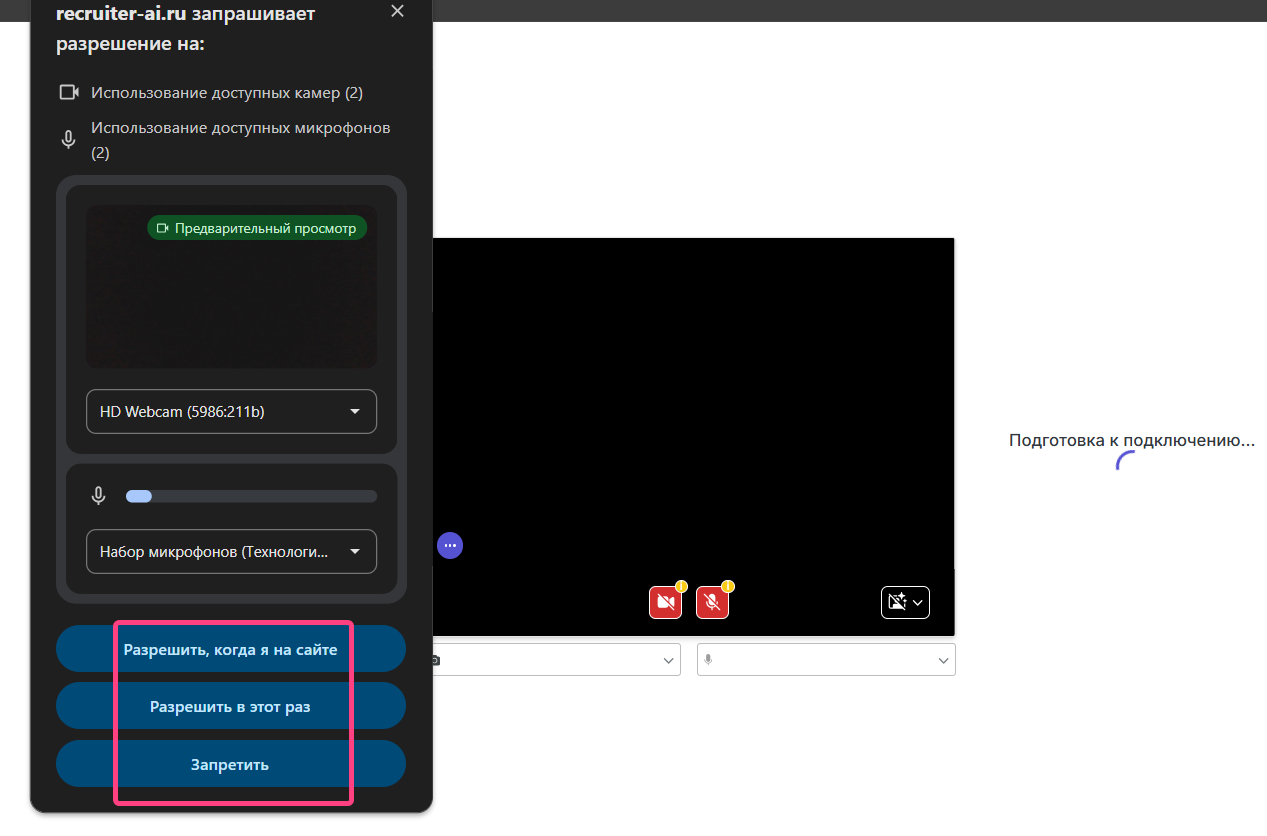 - Step 2: Check your equipment The system will request access to your camera and microphone. Click Allow. A page with instructions and a waiting indicator will open: “Candidate ... is ready and waiting.” Wait until the recruiter starts the interview.