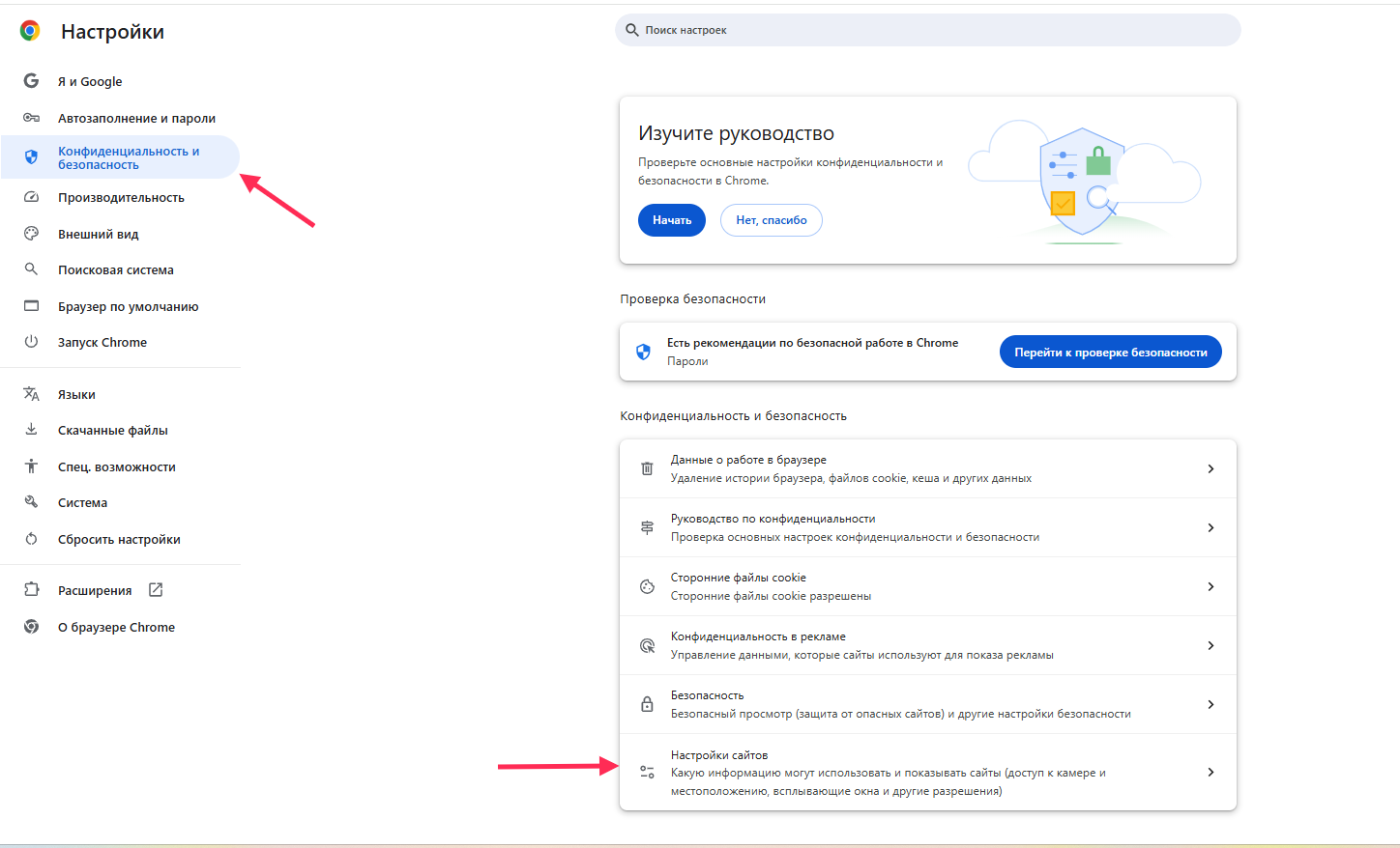 - In the left menu, select Privacy and security → Site settings.