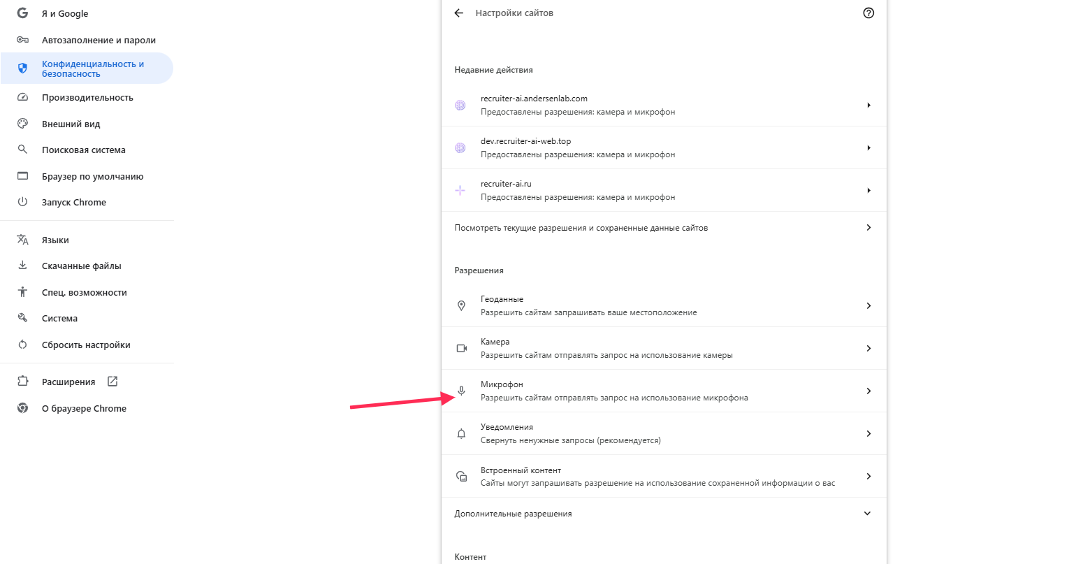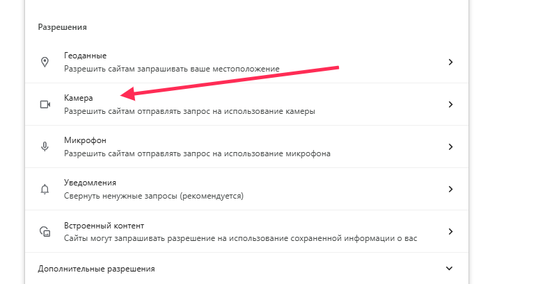 Browser settings for Chrome: how to allow camera and microphone access.