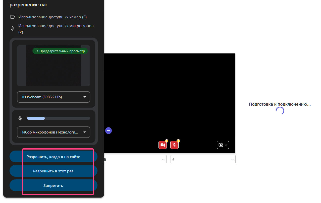 - The system will request access to the camera and microphone. Click Allow.