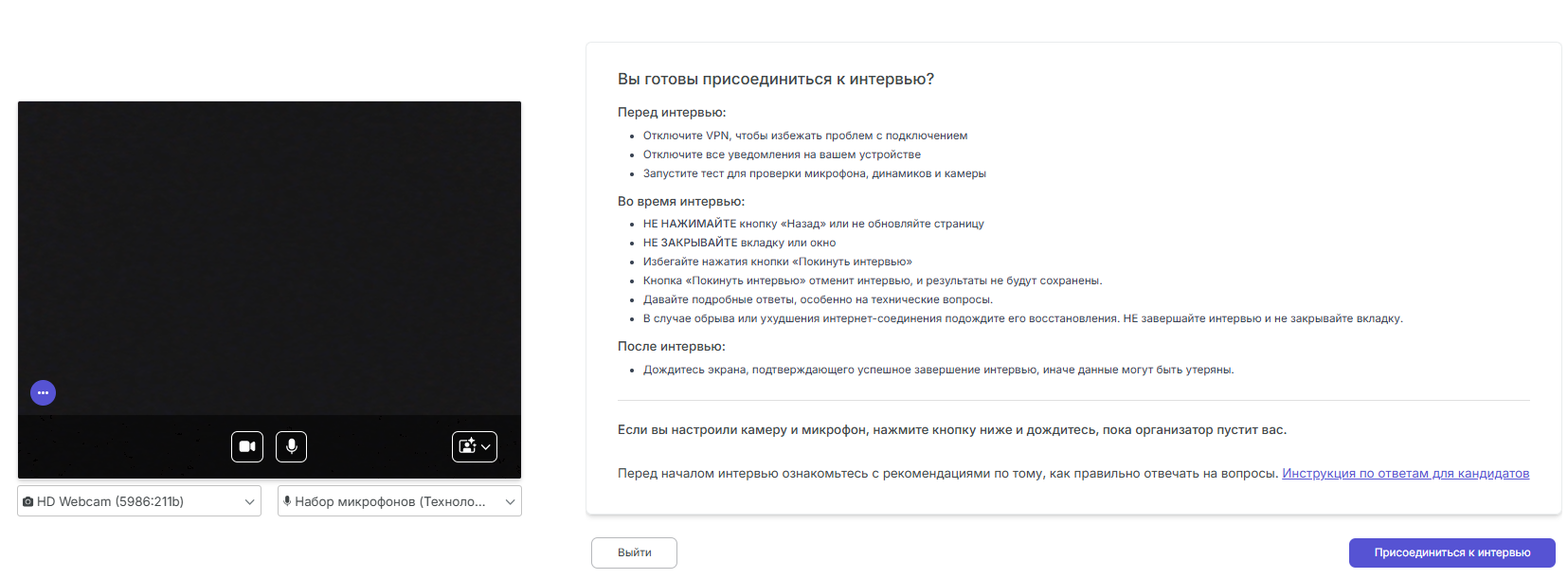 Important: The candidate receives a unique link from the interviewer to join the video meeting through any convenient messaging service and opens it at the scheduled time.