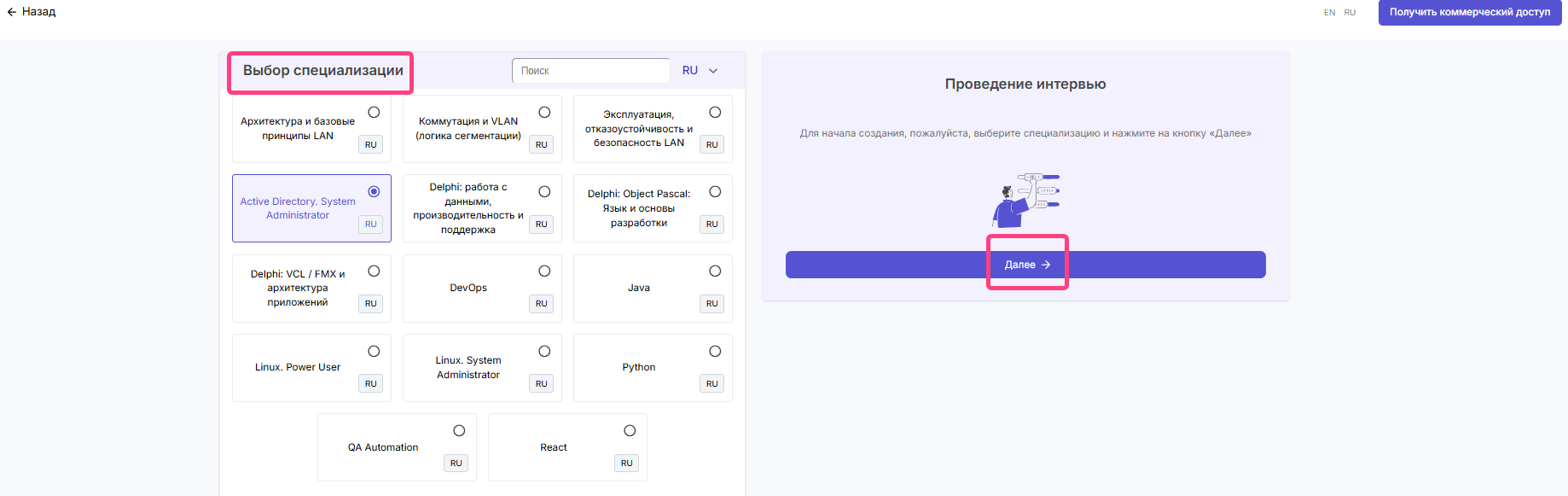 - On the Welcome page, select the Interview card.