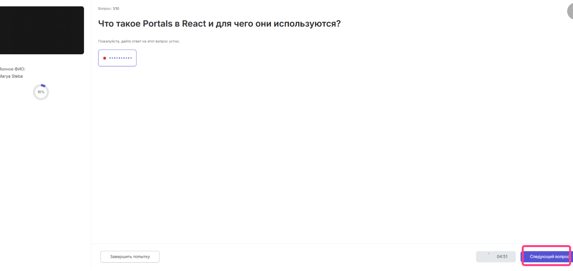 - Progress, meaning the question number, for example Question: 1/10, and the completion indicator.