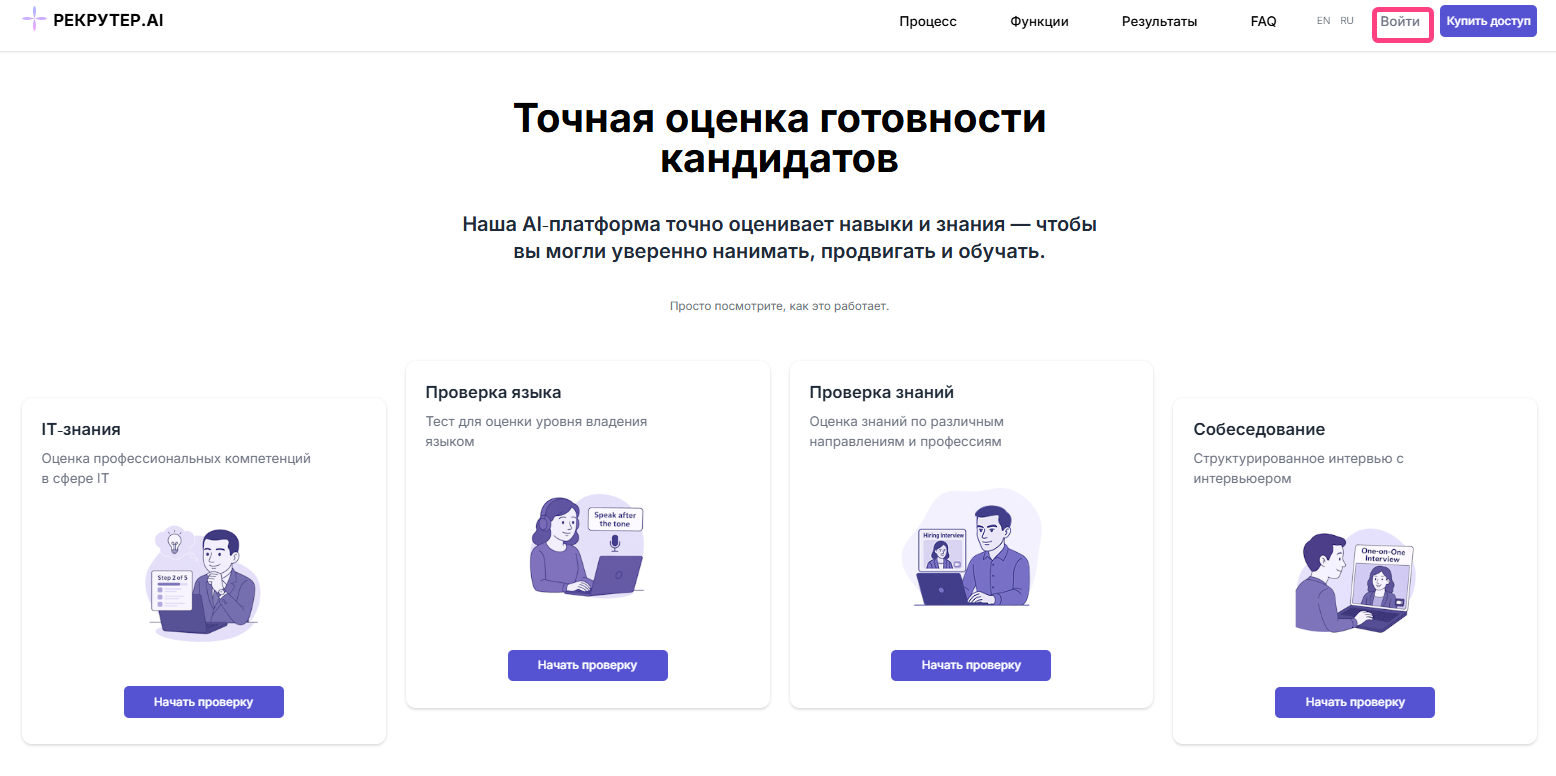 - P2P: choose the Interview card -> Start assessment -> choose a specialization -> register using email and password. After that, you immediately enter your personal organization.