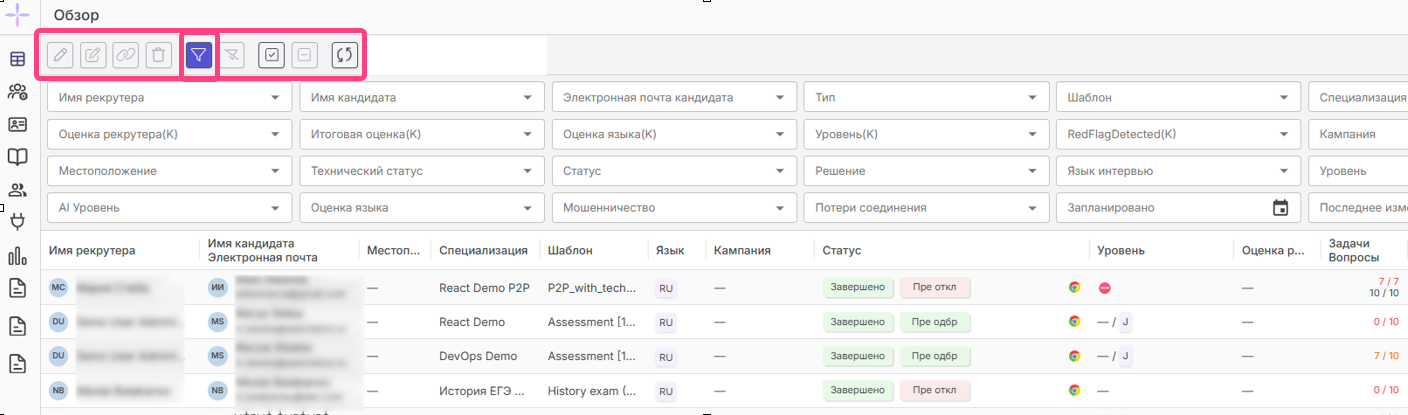 - Search: click Show filters to find interviews by candidate, status, specialization, and other parameters.